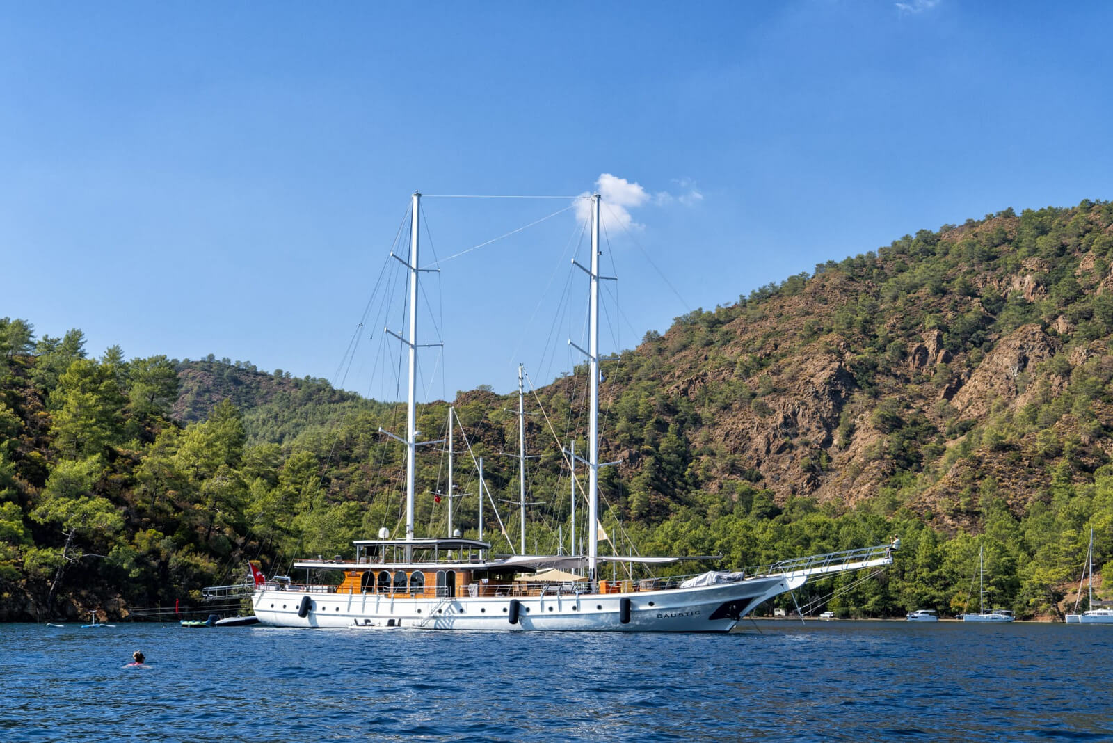 For moments of relaxation and pampering, "Caustic" offers a spacious deck with comfortable sun loungers, perfect for basking in the Mediterranean sun or stargazing at night. The attentive and professional crew is dedicated to ensuring an impeccable experience throughout the journey, making "Caustic" the epitome of luxury and leisure for an unforgettable yacht charter in Turkey's coastal paradise.