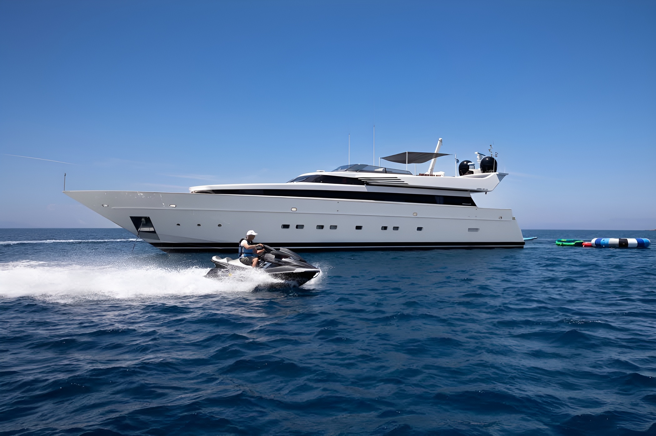 The motor yacht ENERGY comes equipped with a collection of water toys and tenders, perfect for adventure and leisure. Guests can enjoy a 5.3m Novurania tender powered by a Yamaha F-115 engine, a Yamaha F2S jet ski, a thrilling slide, and a Seabob for underwater exploration. Additionally, the yacht offers two stand-up paddleboards (SUPs), adult and junior water skis, a wakeboard, two tubes, and a towable sofa for up to three passengers. These options ensure a memorable experience filled with excitement and relaxation on the water.