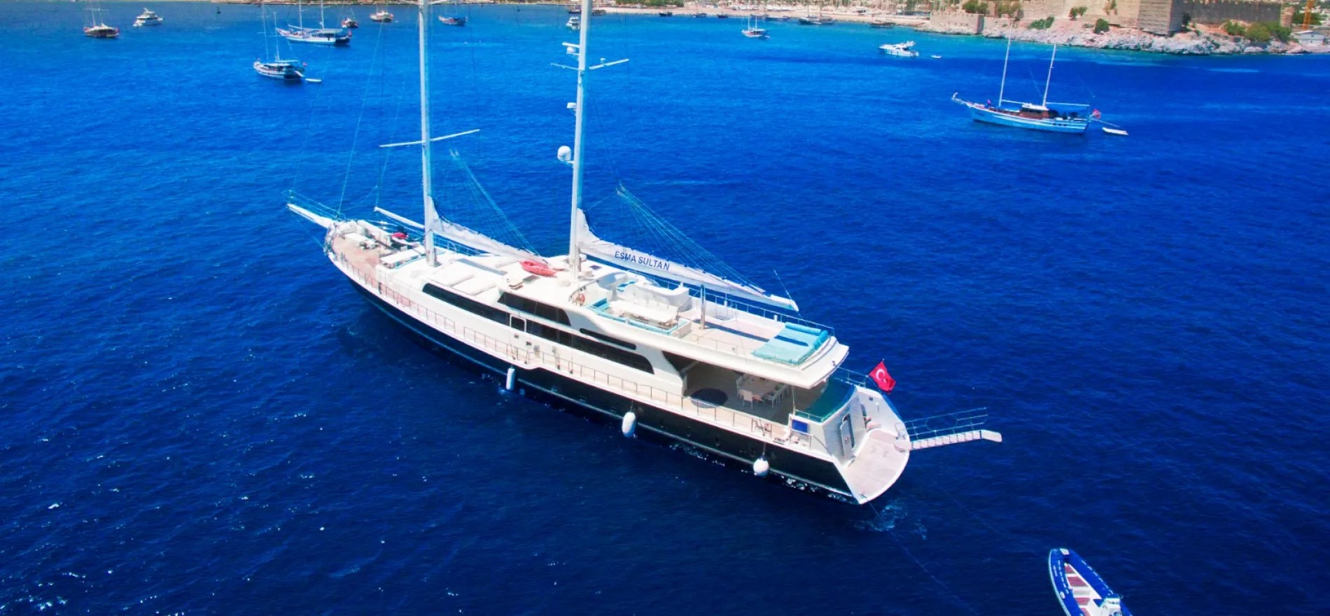 ESMA SULTAN is a beautiful gulet and as she is 40 meters with 7 cabins available, she can comfortably accommodate a large group of up to 16 guests. She also has a large amount of space to accommodate for all 16 guests as she is fully equipped with sun mattresses for sunbathing as well as multiple areas of cushioned seating area across the yacht. Onboard is a highly trained and professional 6 crew members which consists of a captain, chef, 2 deckhands, a hostess, and a housekeeper, whose sublime hospitality services perfectly match the luxury shown in the design of the yacht and will provide a fantastic yacht charter experience.