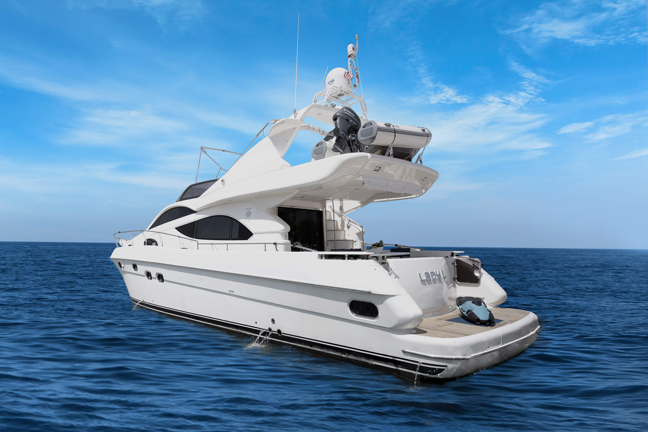LADY L is equipped to welcome a maximum of 8 guests. She has 4 en suite cabins on board that comprise of 2 double cabin and 2 twin cabins with ensuite facilities. She also has a seating group and a dining table in the salon, dining table on the aft deck, a flybridge seating group and table, sunbathing on the foredeck, and a crew cabin.