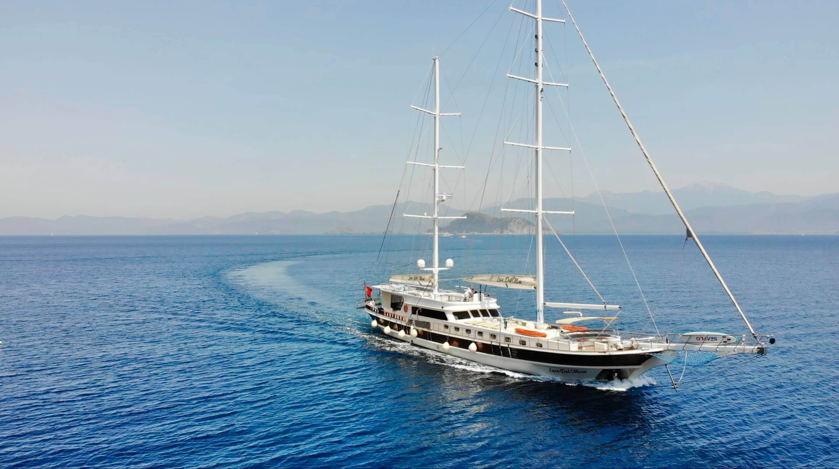 LUCE DEL MARE is equipped to comfortably accommodate up to 12 guests in 5 deluxe, en suite cabins. Her cabins are made up of 1 master cabin with a double bed for 2 guests, 2 double cabins with double beds for 4 guests, and 2 triple cabins with beds for 6 people. She is also fully equipped for 12 guests in all other areas of the yacht with facilities such as the cushioned seating areas that can be found on the foredeck, the aft deck and the inside saloon area.